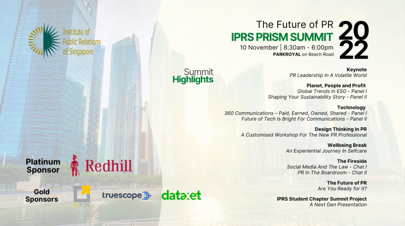 “The IPRS was established in the earliest days of Singapore’s PR practice. Today, it continues to uphold the value that the profession brings to people and organisations. In this Inaugural IPRS PRISM Summit 2022, we challenge our industry to refresh the purpose of communications and how it makes a difference now and in the future. We look forward to welcoming and hosting our distinguished speakers, IPRS members, practitioners and friends of our PR community,” says Koh Juat Muay, President IPRS.